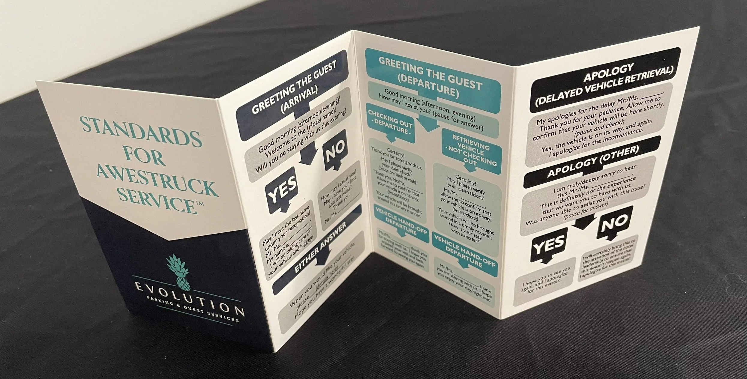 "7 Steps to AWEstruck Service" training program follows the new hire Valet Skills checklist training program. It reinforced the flow of the service standards to help the valets remember all the aspects within the Arrival and Departure Experience. Paired with AWEstruck Standards Card and New Hire On-boarding Checklist after the New Hire Orientation gives a great start to all new hires.